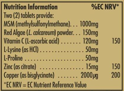 Conține MSM, siliciu și praf de alge roșii (L-coralloide, dioxid de silicon) și amino-acizi (L-Lysine și L-Proline).